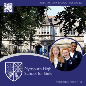 Plymouth High School for Girls Prospectus Years 7 -11 Thank you for your interest in Plymouth High School for Girls. We are a selective girls’ Grammar School, with boys accepted into the Sixth Form. Our long, proud history of academic achievement and our commitment to providing a modern, engaging curriculum ensures that our learners enjoy a rich and fulfilling experience at Plymouth High. Choose us to ensure that your child will be stretched academically, offered a wide range of exciting opportunities, and to have the space to develop and grow into whomever they wish to be. We pride ourselves in offering a firstclass academic education with a good balance between challenge and support. We develop the natural enthusiasm and motivation that our students possess to enable them to become resilient and independent learners. Our students want to achieve the very best results, and we share this ambition. At Plymouth High, we pursue academic rigour and excellence within a kind and supportive environment. A Plymouth High School student is expected to work hard and to do their best, and in return, they can be sure of a friendly and encouraging learning environment where each person is treated as an individual. We offer a wonderfully diverse range of opportunities at Plymouth High, both inside and outside of the classroom. We have something for everyone and encourage our students to expand their horizons and to get involved in school life. Whilst we celebrate individual achievements, we also foster collaboration and teamwork, pulling together and enjoying successes as a group. Many things have changed since our opening in 1874, but our school motto, Non scholae vitae discimus (For life, not school, we learn), is as important to us today as it was in the 19th century. Simon Underdown, Headteacher WELCOME from the Headteacher FOR LIFE, NOT SCHOOL, WE LEARN