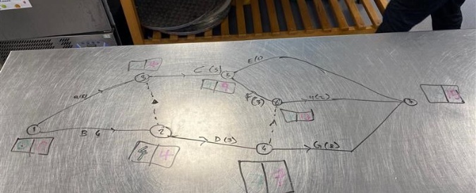 Mr Goodchild and his Year 12 Further Maths students went rogue from the whiteboard and exercise books yesterday and used the food tech tables to map out their own trees and networks problems as part of their A level Further Maths study.