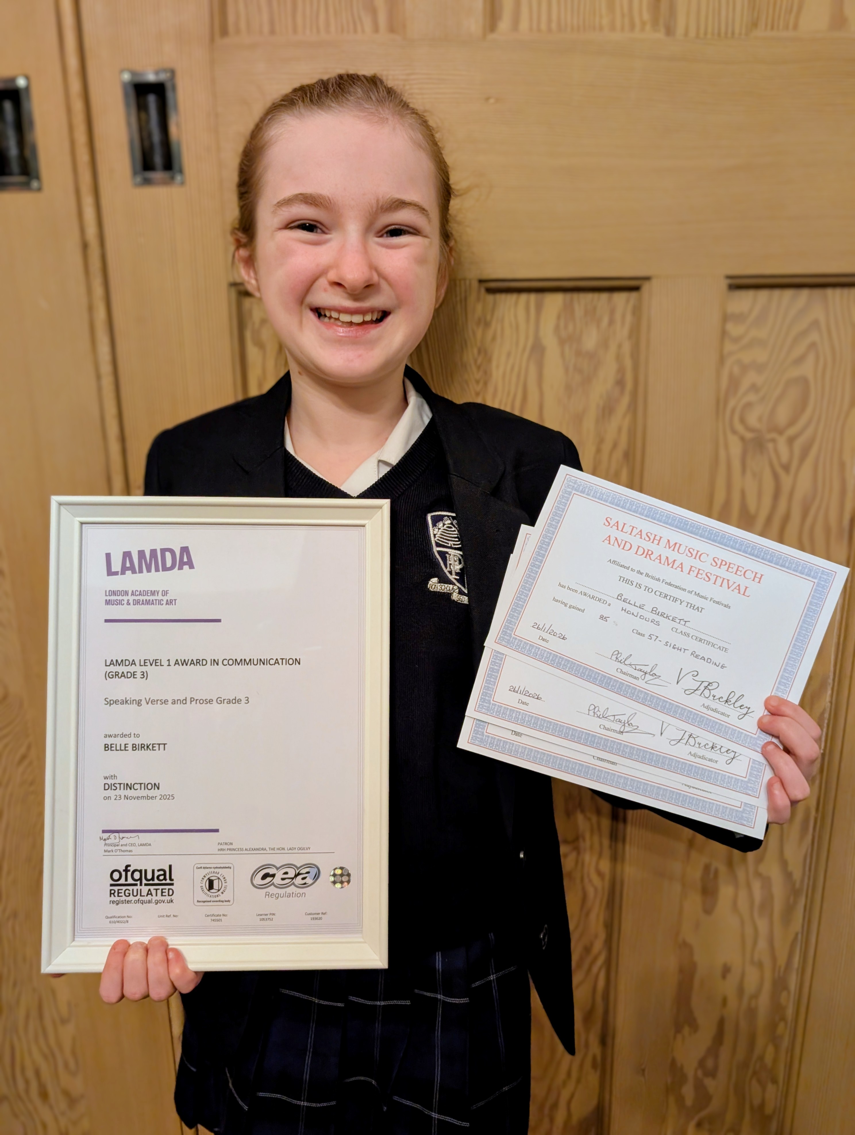Also in January, Belle B (Year 7) showcased her talent and confidence at the Saltash Drama Festival, achieving outstanding success across multiple categories. Belle placed 4th in Set Verse, 3rd in Sight Reading, 2nd in Bible Reading, and secured 1st place in Object Story Telling; an excellent achievement. In addition to her festival success, Belle also recently passed her Grade 3 LAMDA Verse and Prose examination with Distinction, highlighting her dedication, performance skills, and growing confidence as a young performer.