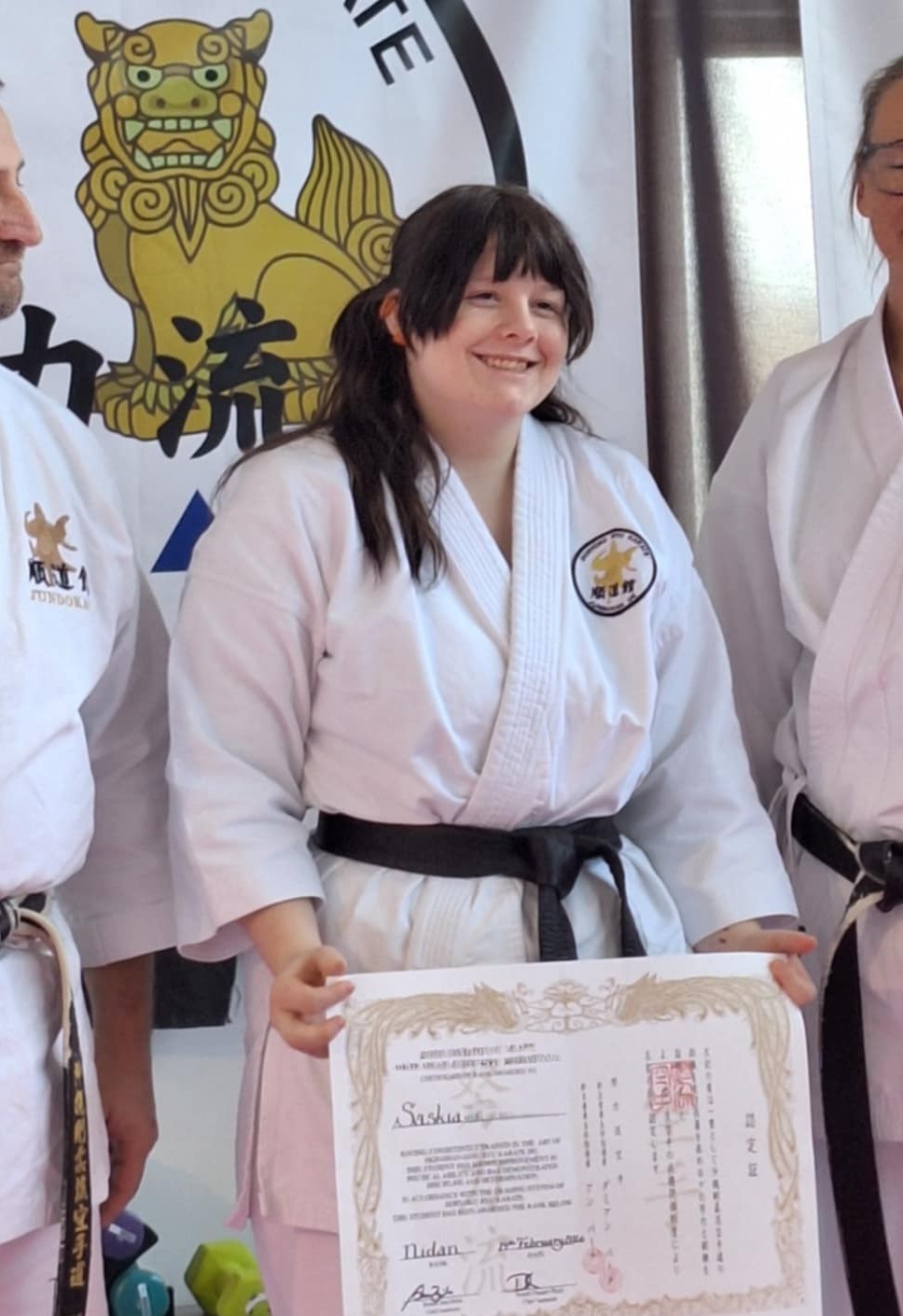 Saskia developed a passion for karate in her first year of primary school and now trains up to 4 hours a week.  Her dojo is represented by students from Devon, Cornwall and Somerset, and during her training there, Saskia has achieved 10 gold medals, 17 silver medals and 13 bronze medals.  She has also earned the titles of Club Champion (2018), Shodan (2023) and of course now, Nidan.